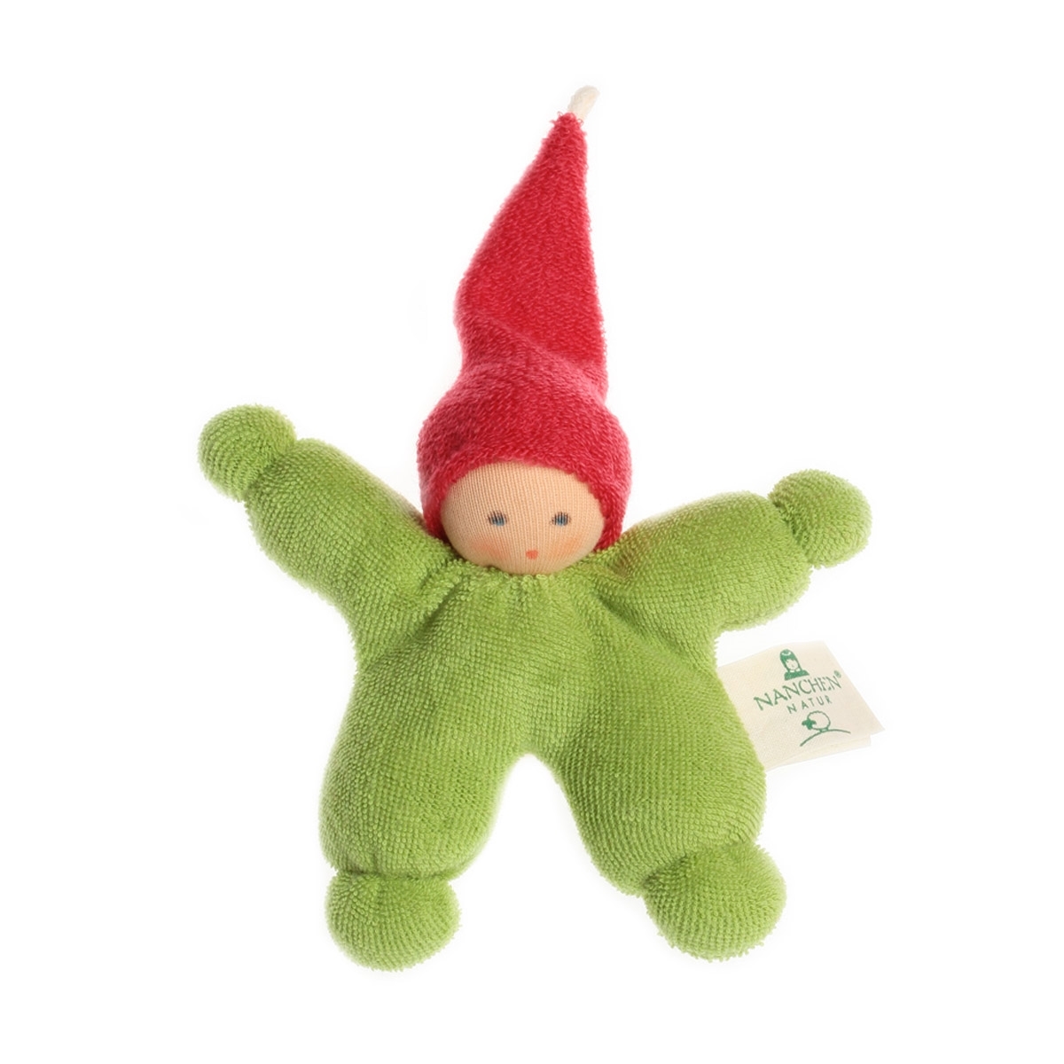 Tout petit doudou lutin vert à bonnet pointu rouge aux couleurs vives obtenues par teinture naturelle de la collection de Nanchen Natur. Les enfants adorant les couleurs vives, ce jouet à saisir en coton bio et laine bio sera un compagnon de jeu très apprécié par bébé dès sa naissance et pourra également être utilisé plus tard pour jouer dans la maison des lutins.