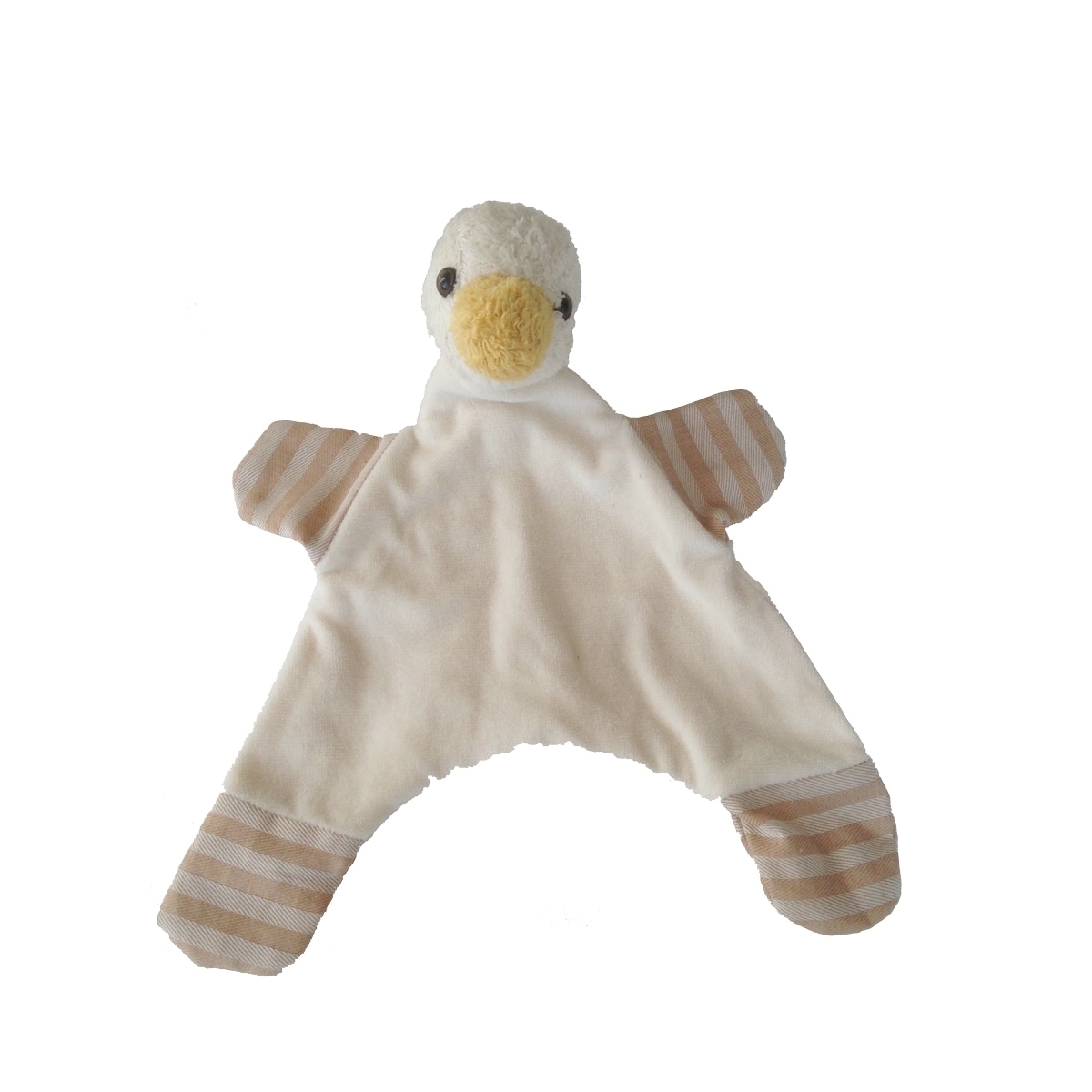 Doudou plat canard fabriqué en coton bio. La tête du canard doudou plat est rembourrée de laine bio et recouverte de peluche 100% coton bio, son vêtement en velours coton bio blanc tout doux, ses pattes en tissu coton bio rayé beige clair et beige foncé. Le canard doudou en coton bio peut se laver à la main ou en machine sur cycle de laine. Ce doudou canard sera le réconfort et le compagnon de jeu de votre bébé dès sa naissance.