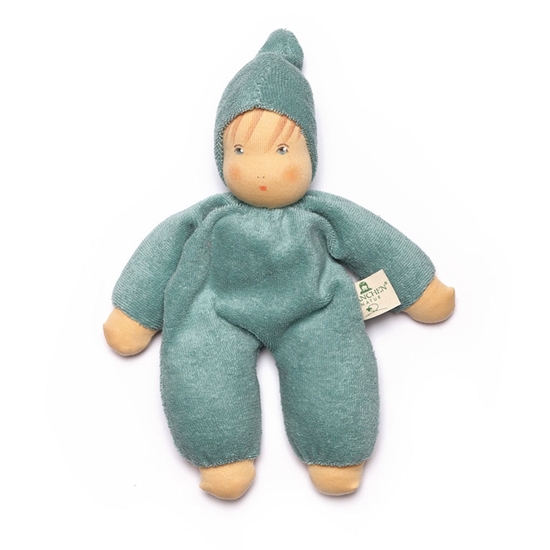 Poupée Nanchen Schmuse mint, doudou pour dormir, porte une tenue et un bonnet pointu vert menthe. La poupée restera un compagnon de jeu fidèle dans le berceau et aussi après. Un doudou naissance pour garçon idéal.